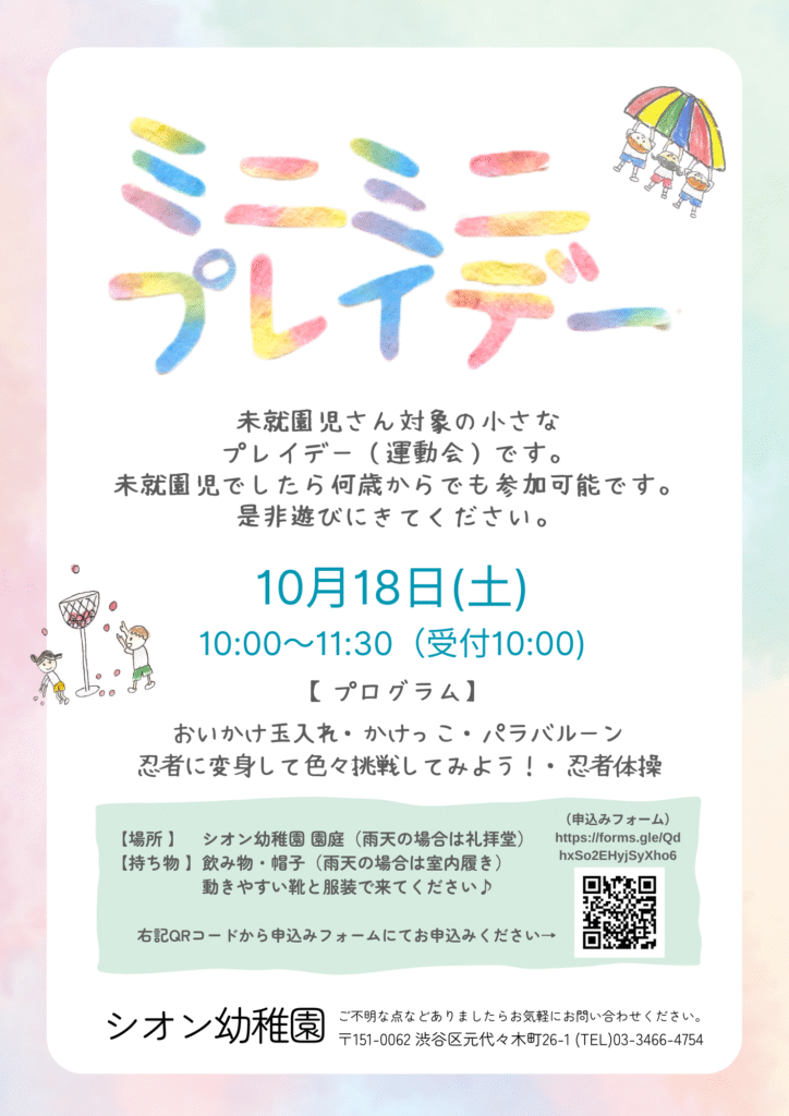 お知らせ2025.10.07 rs1430008blog ミニミニプレイデー(未就園児親子の会) 2025年10月18日(土) 申し込みはこちらからお願いします。 https://00m.in/qUQDI