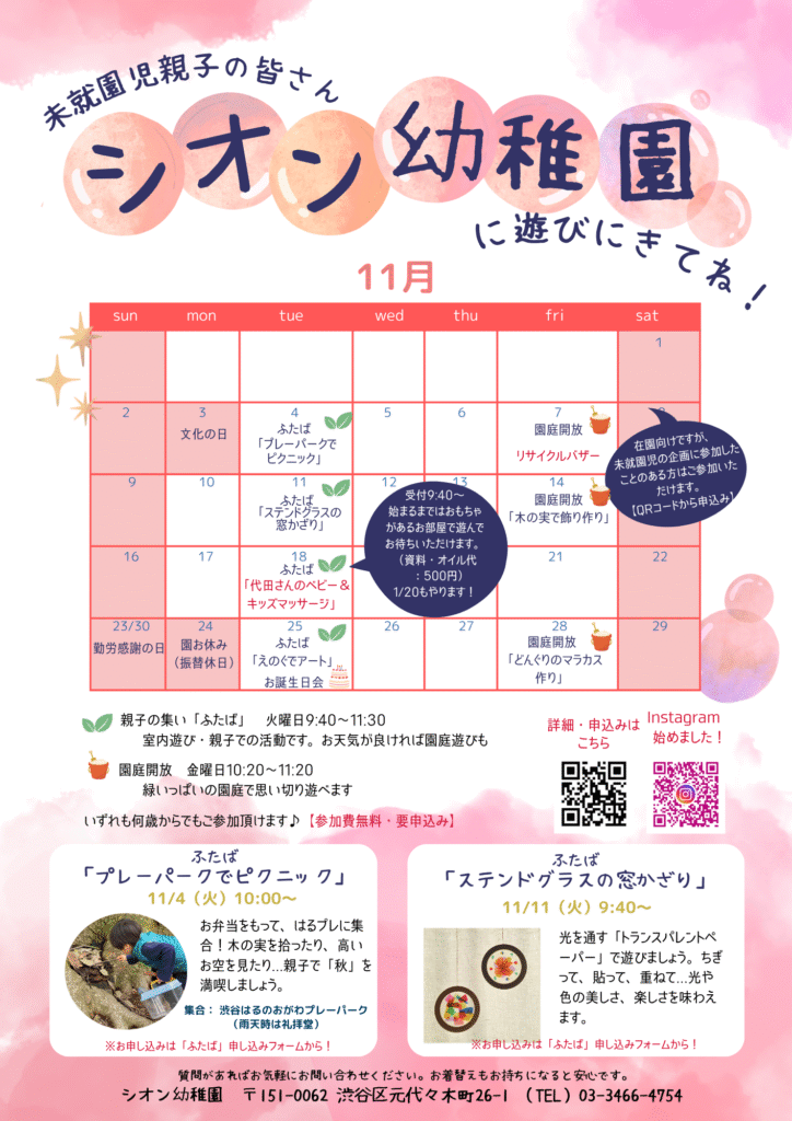 シオン幼稚園では毎週火曜日9:40~11:30に親子の集い「ふたば」を開催しており、何歳からでもご参加頂けます♪