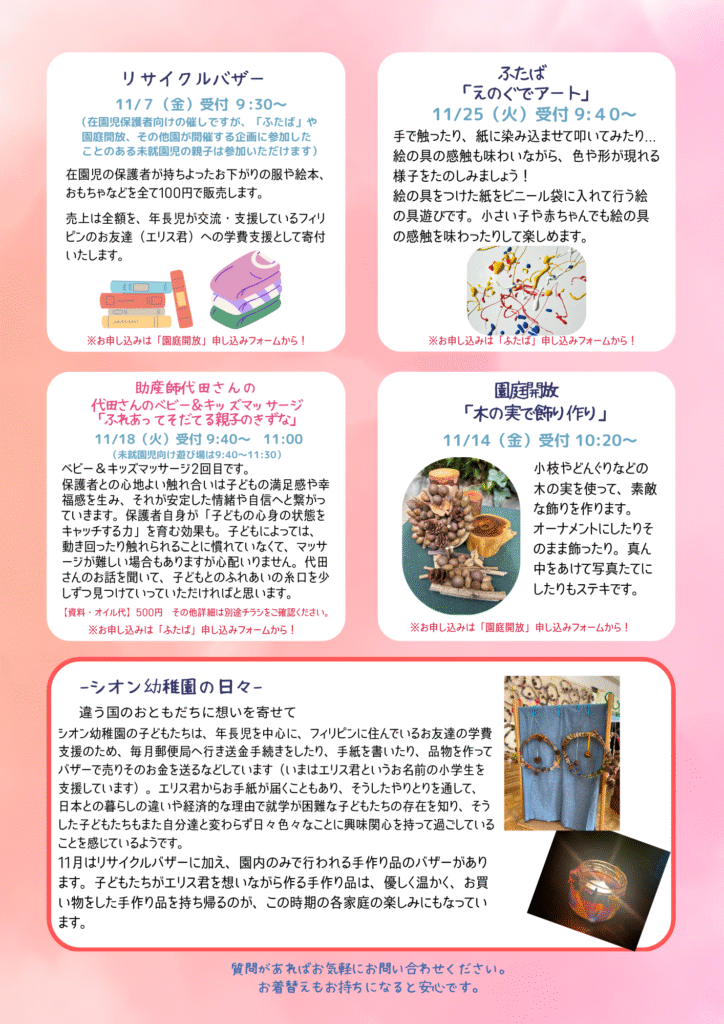 そこで、「シオン幼稚園親子の集い」(ふたばの会)を運営しています。